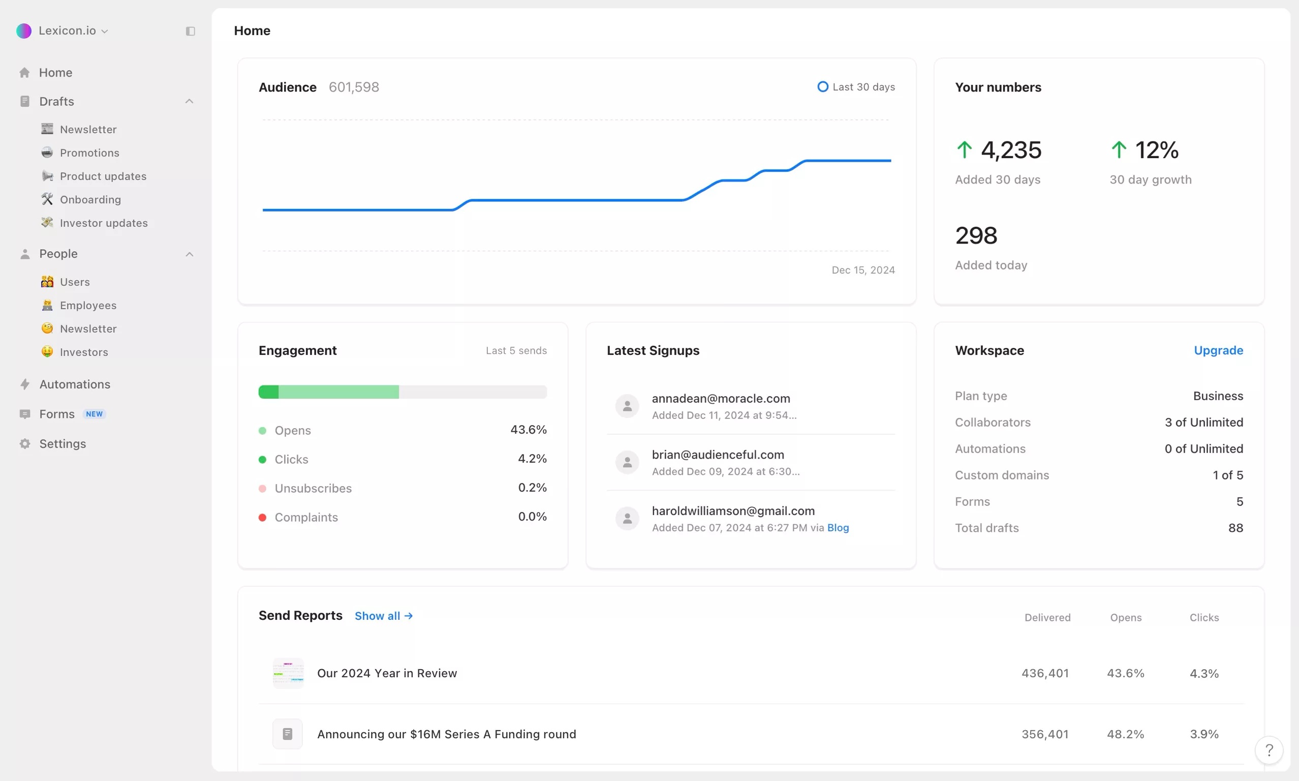 Audienceful is an email platform designed to simplify how businesses and creators manage email marketing and content publishing, especially for those who rely on Webflow. Instead of juggling multiple tools, Audienceful lets you collect signups, send newsletters, and publish Webflow posts from a collaborative editor that feels as intuitive as Google Docs or Notion. This makes it particularly useful for teams that want to streamline their workflow while still maintaining full control over their brand messaging. For businesses exploring alternatives to traditional email marketing software, Audienceful stands out as a modern solution that merges email campaigns with on-site content, something tools like Mailchimp and other legacy providers do not natively offer.